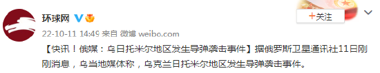 [快訊!俄媒:烏日托米爾地區發(fā)生導彈襲擊事件]據俄羅斯衛星通訊社11日剛剛消息,烏當地媒體稱(chēng),烏克蘭日托米爾地區發(fā)生導彈襲擊事件。